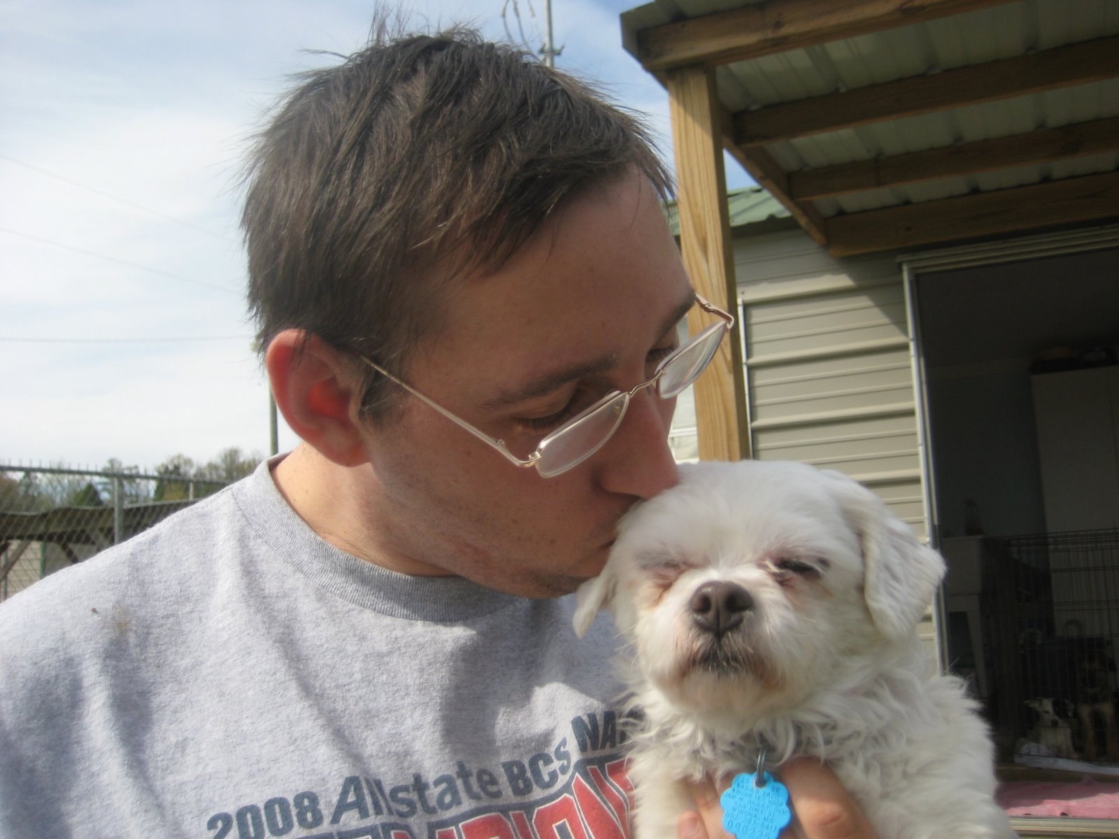 Petey was rescued by Doll from a man who kept him tethered 24/7. As a result, Petey had some serious issues. After months of working with him to improve his temperament, he found a home. Here he is with his new guardian, Bobbie.