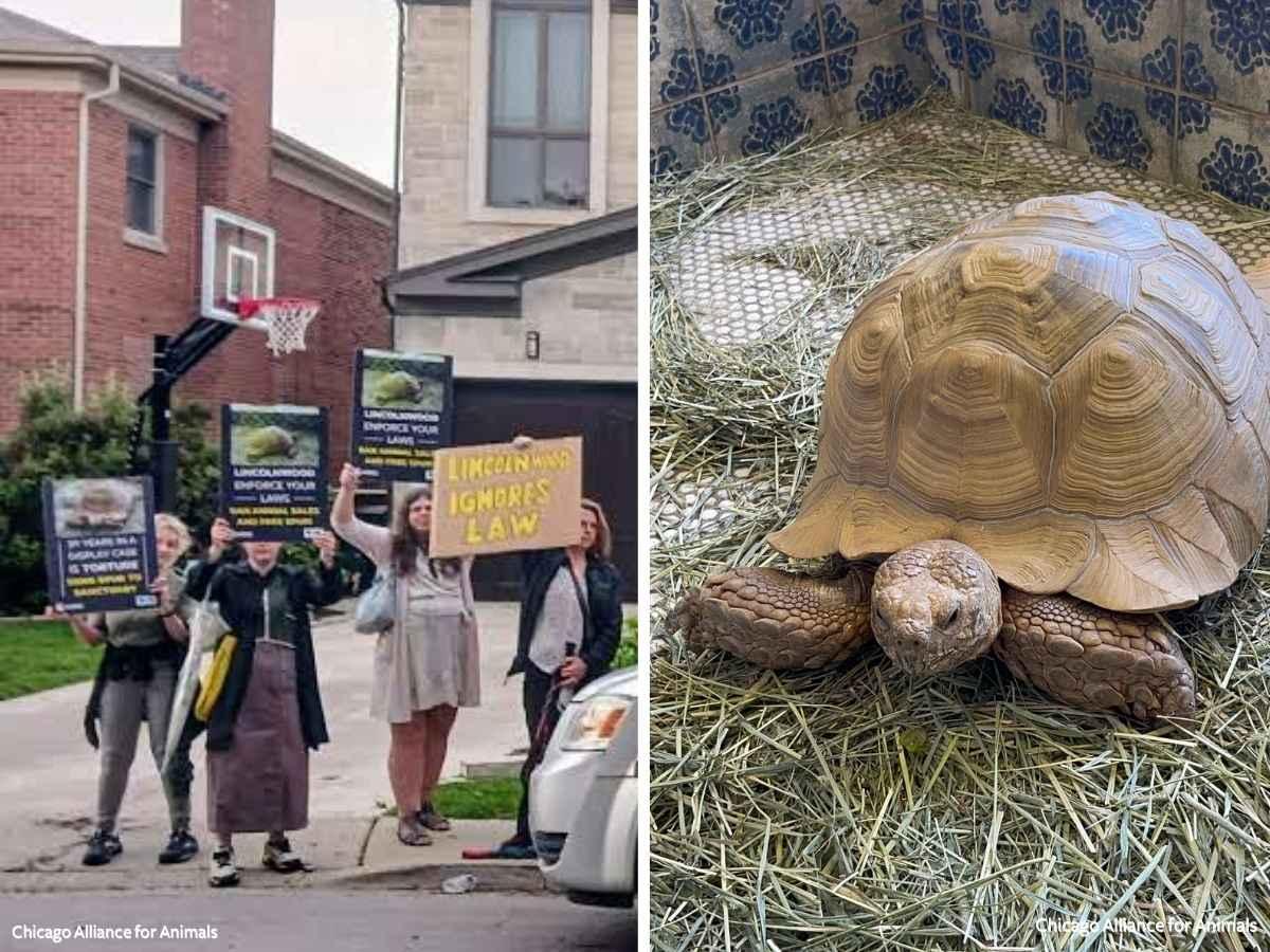 LINCOLNWOOD, Ill. (June 4, 2025) — Concerned Chicagoans with In Defense of Animals and Chicago Alliance for Animals (CAA) rallied in Lincolnwood on Friday to demand freedom for Spur, an endangered African spurred tortoise who has been confined for more than three decades in a small, tiled display case inside The Animal Store. The peaceful demonstration ended outside the home of Lincolnwood Mayor Jesal Patel, calling on him to enforce the village’s own ordinance banning the keeping of wild animals.