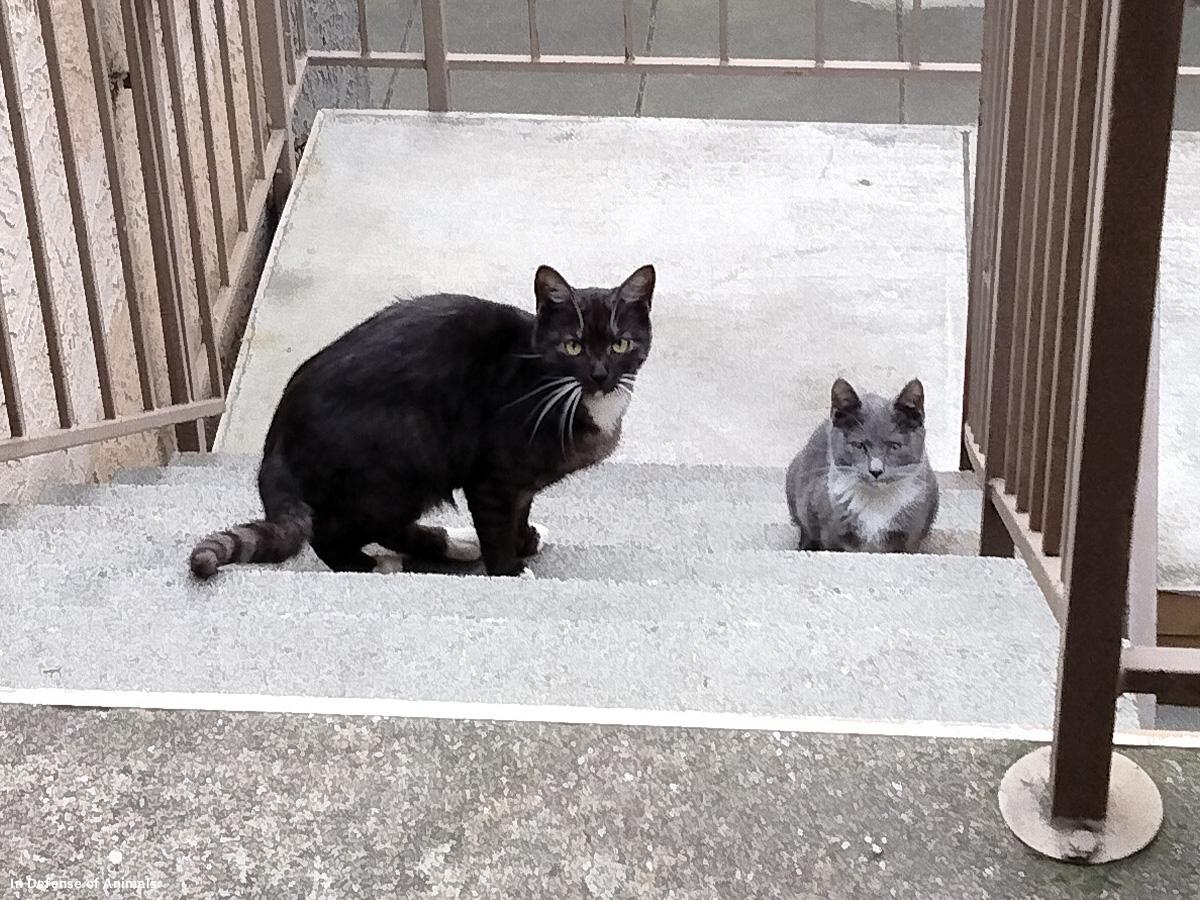 Near the end of December, she started appearing with a pair of kittens in tow. She, her two kittens, and her mostly black with a bit of white partner, now named Papa, seemed to be living under the building in an air shaft with their kittens. The kittens were assumed to be from different litters as one was so much smaller, despite almost identical gray with white coloration.