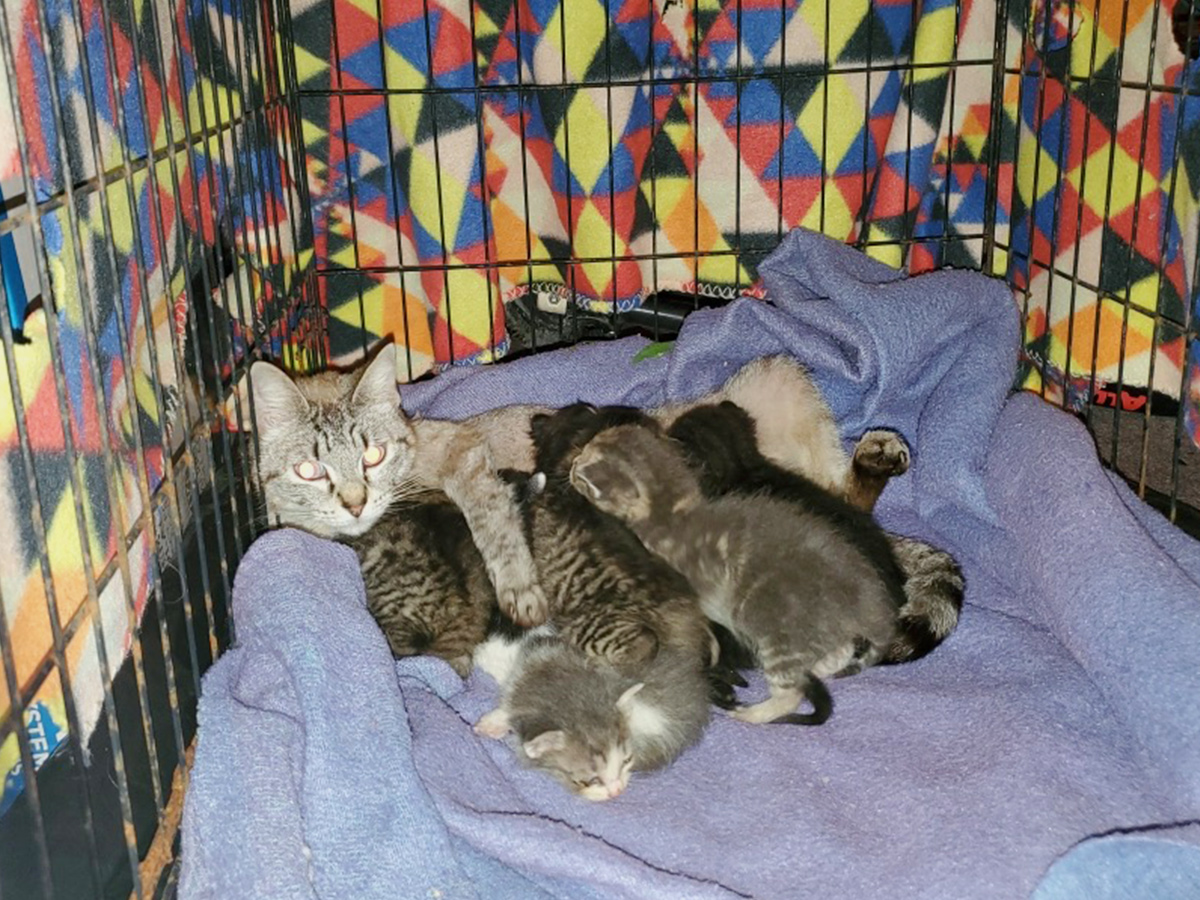 Momma cat has adopted four helpless kittens in addition to her own.