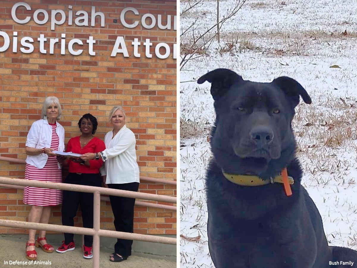 In Defense of Animals contacted George’s guardians, the Bush family, to assist them in gaining justice for the horrendous killing of their companion and best buddy to their son. On May 9, 2023, In Defense of Animals’ Justice for Animals Senior Campaigner, Doll Stanley, and Crystal Springs Mayor Sally Garland presented District Attorney Daniella M. Shorter with a letter signed by 17,328 advocates calling for the prosecution and maximum sentencing of Berthelette.