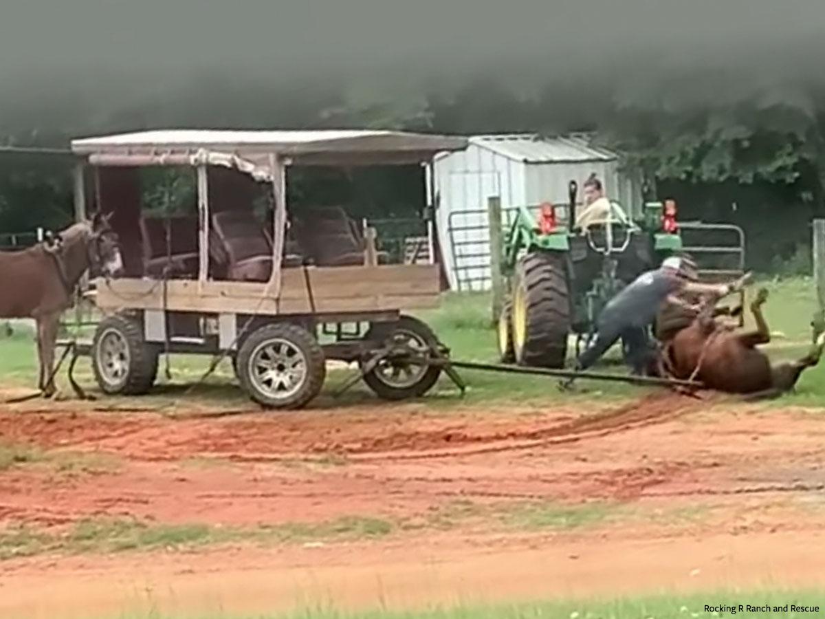 In one video, the horse bucks and violently resists being pulled along by a tractor. In a second video, the horse is immobile and dragged along the dirt over the tongue of a wagon, while a man kicks and pushes the horse. In both videos, a mule is tied to a wagon without food, water, or shelter.