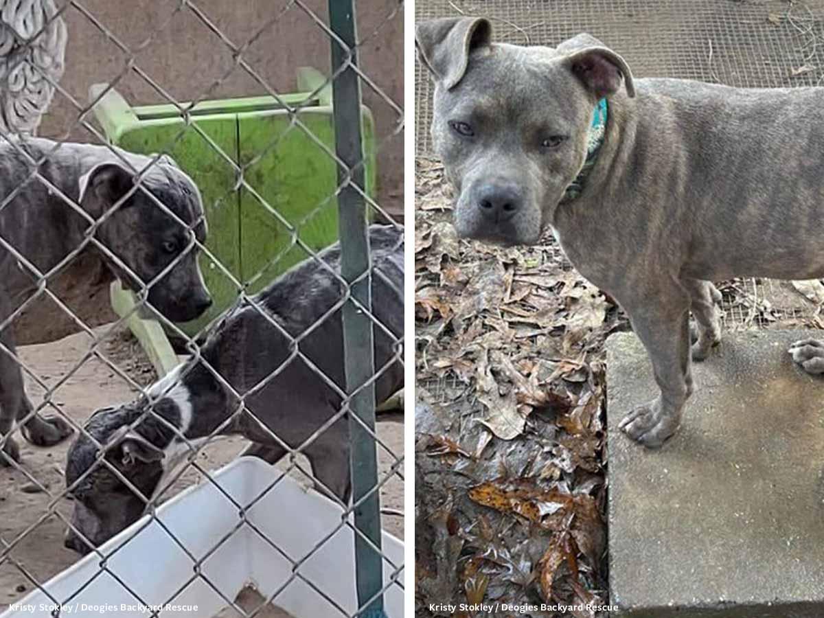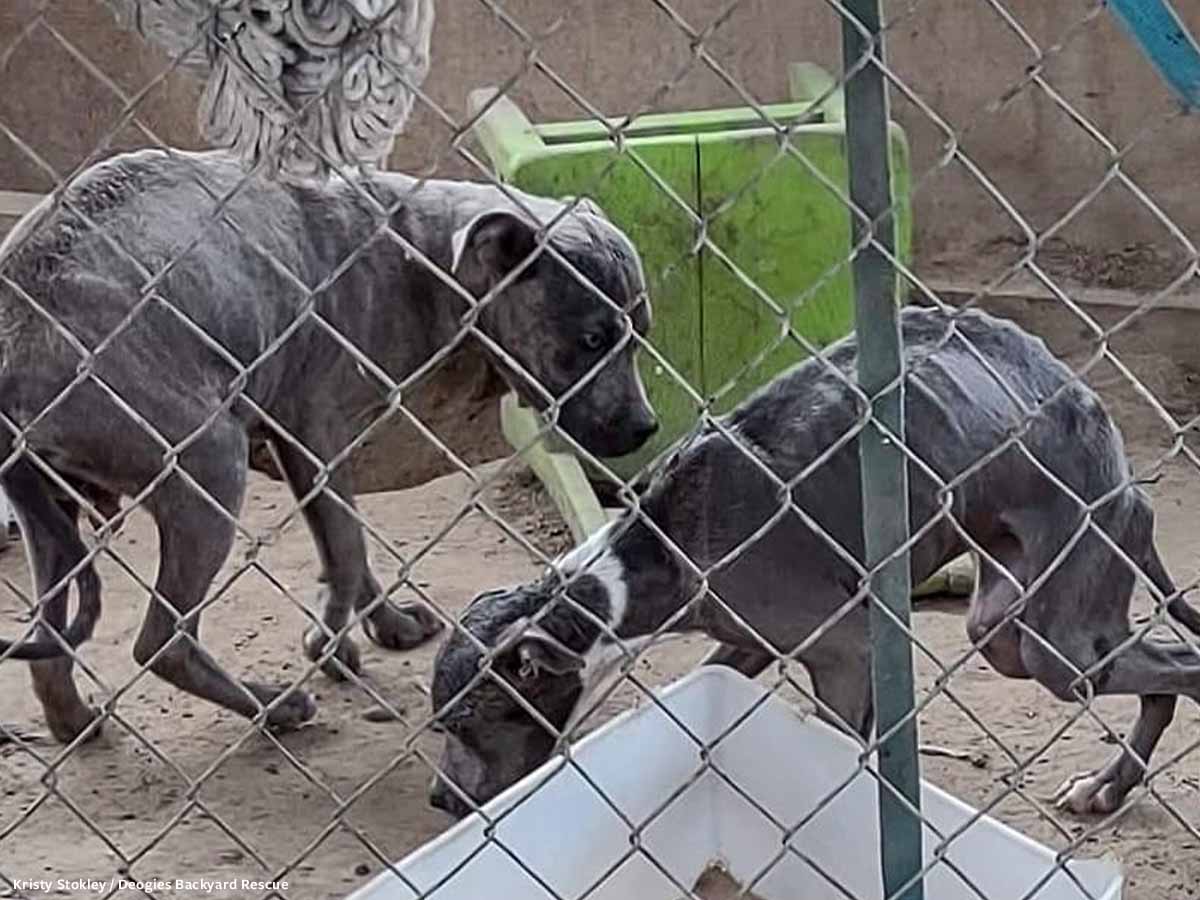 In November 2022, Justin Dail contacted Kristie Stokley, Director of Deogies Backyard Rescue, to get help for a group of dogs he witnessed declining from neglect. One of the three dogs he’d initially seen was now missing, one was thin, and one was extremely emaciated and he hadn’t seen any water left out for them. He and his partner gave the dogs water through a fence, and they desperately drank it.