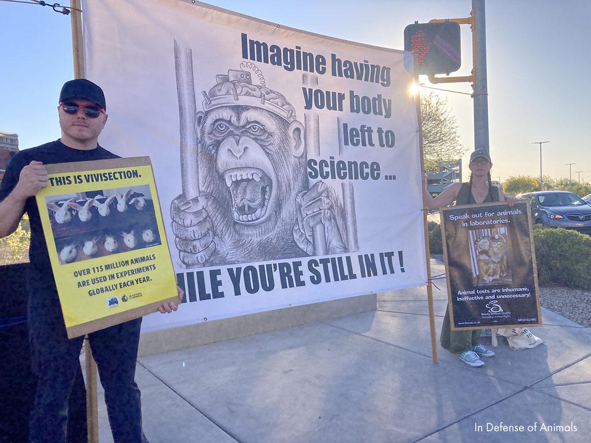TUCSON, Ariz. (April 22, 2025) — On Monday, April 21, In Defense of Animals and Tucson-based animal rights group Supporting and Promoting Ethics for the Animal Kingdom (SPEAK) took a stand against extreme animal cruelty at the University of Arizona’s College of Medicine. The demonstration was in support of World Week for Animal In Laboratories (WWAIL). Activists held signs and displayed banners on the sidewalk next to a busy street.