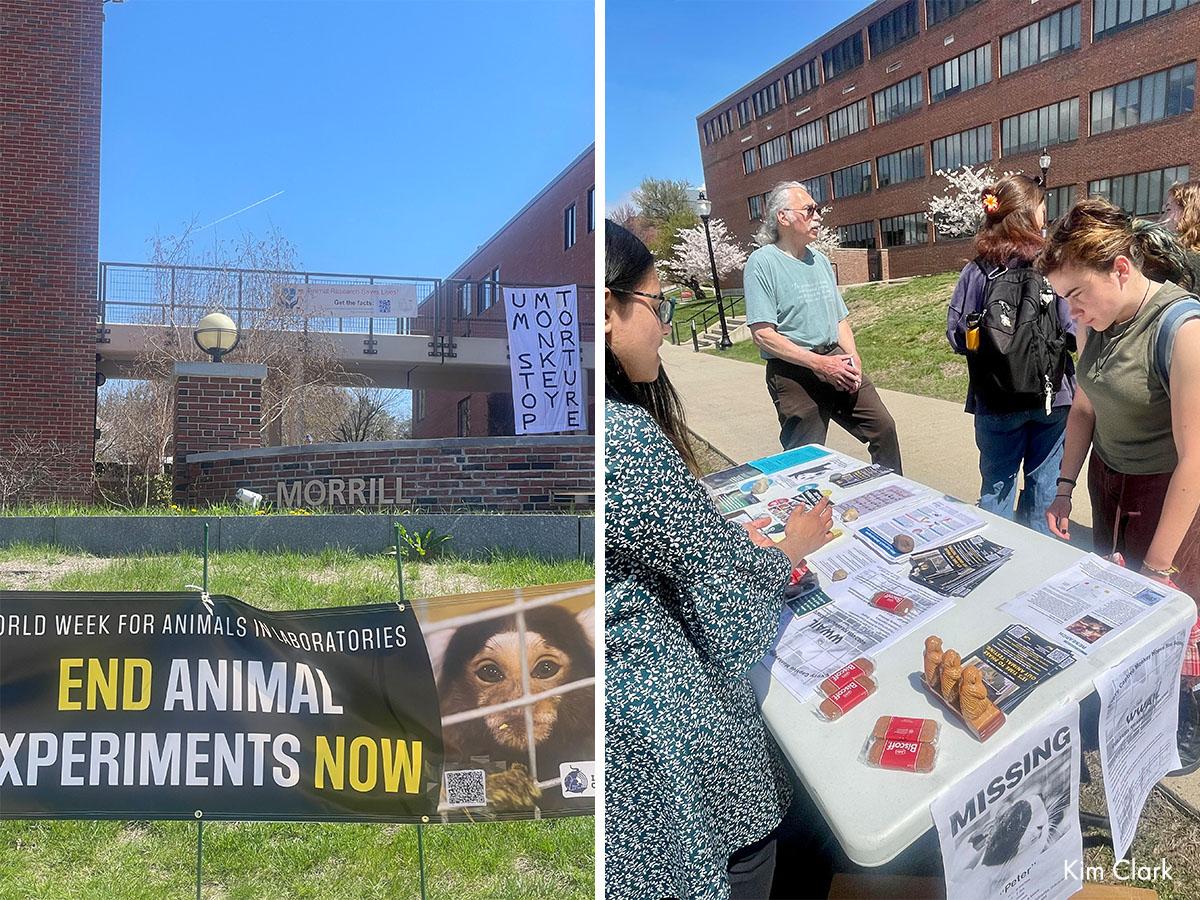 AMHERST, Mass. (April 25, 2025) — On Tuesday, April 22, and Thursday, April 24, In Defense of Animals and Western Mass. Animal Rights Advocates took action against the torture of marmosets and other animals at the University of Massachusetts. The demonstrations were in support of World Week for Animal In Laboratories (WWAIL).