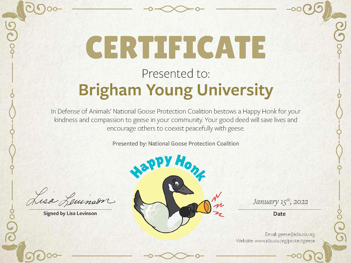 PROVO, Utah. (Jan. 18, 2022) — In Defense of Animals’ National Goose Protection Coalition is pleased to share a story of compassion for animals from Provo, Utah. The National Goose Protection Coalition has issued double Happy Honk certificates to Brigham Young University (BYU) and Wasatch Wanderers for rescuing 32 domestic ducks, 25 turtles, and many goldfish.