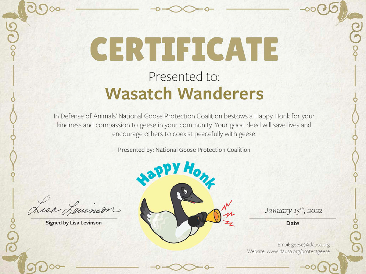 In Defense of Animals’ National Goose Protection Coalition issues Happy Honk certificates to honor good deeds and recognize humane efforts by community members towards waterfowl. The coalition was formed in 2019 to help concerned citizens stop goose cruelty in their communities.