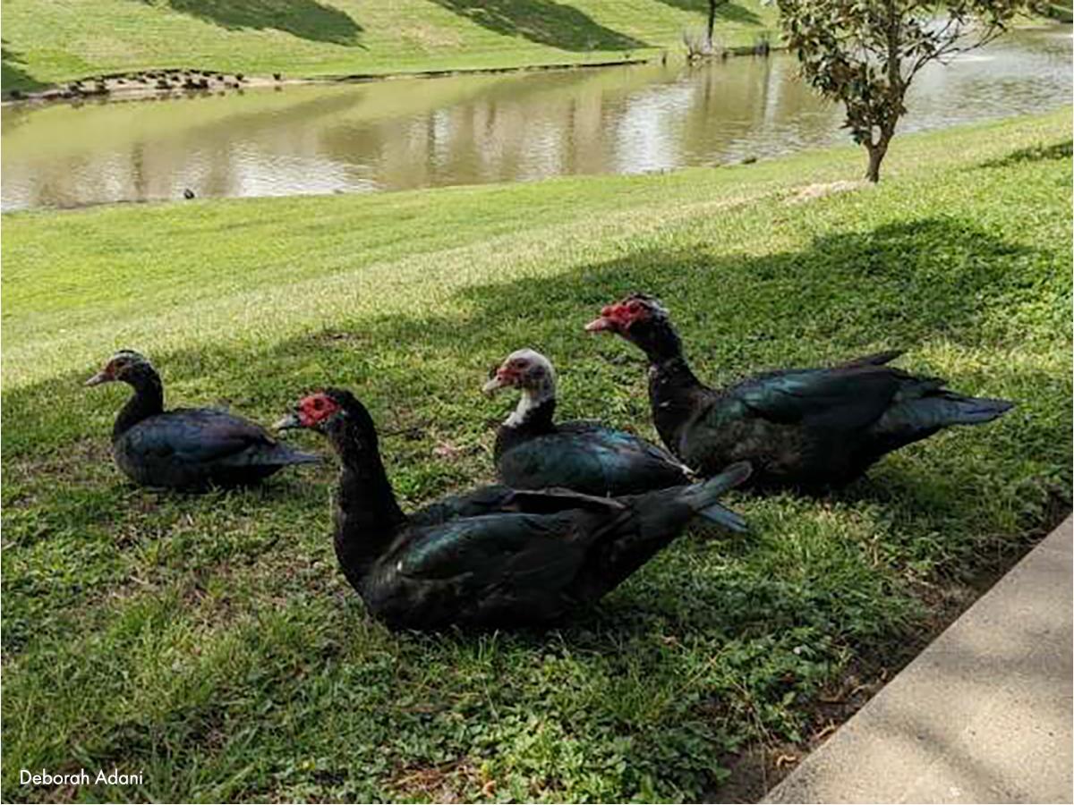 Residents and visitors enjoyed feeding these Muscovy ducks, who lived at the county park and pond in the heart of Copper Grove, which is maintained by Municipal Utility District (MUD) 188. Following complaints about duck dung on the sidewalk, the MUD erected signs banning duck-feeding at the pond. After that happened, residents started feeding the ducks in their yards, where ducklings were safe from pond predators like great blue herons, snapping turtles, owls, and hawks. As a result, the Muscovy duck population proliferated.