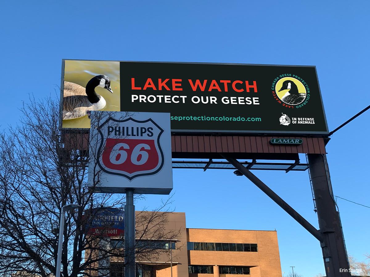 The two billboards read “Dear USDA, Stop Killing Our Wildlife,” and “Lake Watch, Protect Our Geese.” They will appear at the southeast corner of Colorado Blvd. and Mexico starting Monday through Thursday. The campaign addresses the USDA’s failure to be transparent in informing the public on projects aimed at killing wildlife using taxpayers’ money. The campaign also encourages citizen participation in learning more about lake ecosystems and surrounding wildlife.