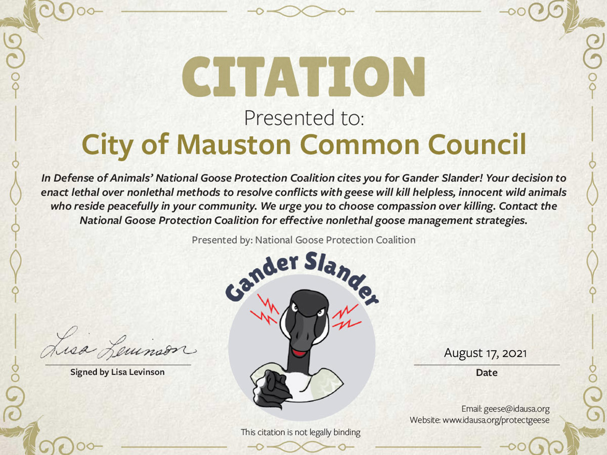 MAUSTON, Wis. (August 17, 2021) — In Defense of Animals and Alliance for Animals condemn the ruthless massacre of 124 geese and goslings by the city of Mauston and the U.S. Department of Agriculture (USDA). The National Goose Protection Coalition has issued a citation for Gander Slander to the city of Mauston for its cruelty.