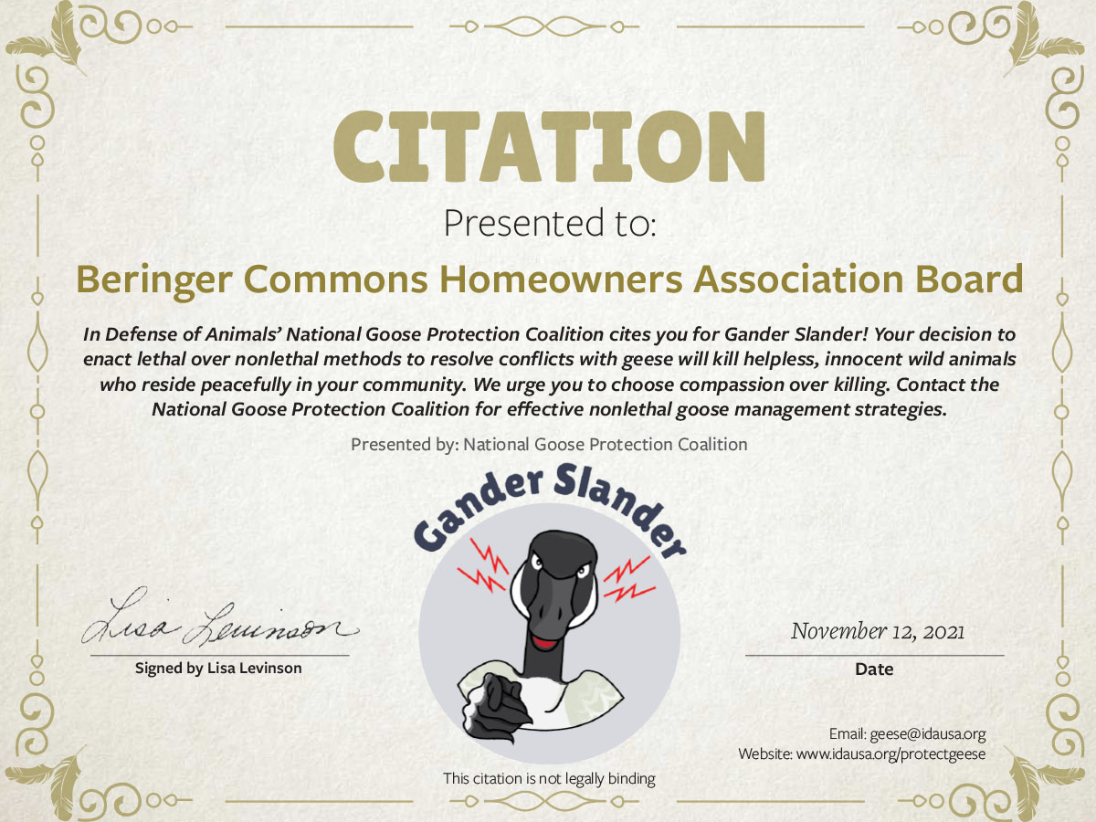 The National Goose Protection Coalition has issued triple Gander Slander citations to the Beringer Commons Homeowners Association Board as well as the City of Urbana and Champaign County. Image: In Defense of Animals