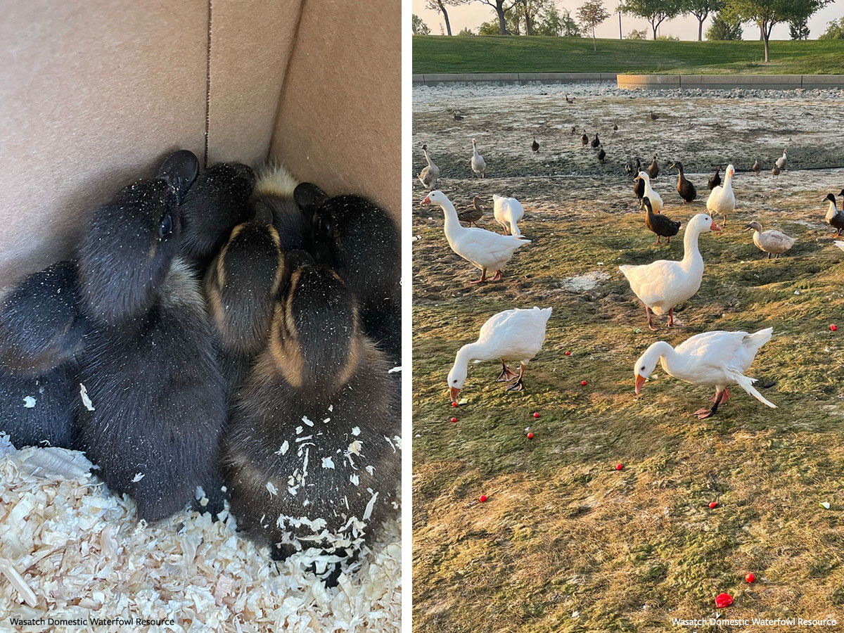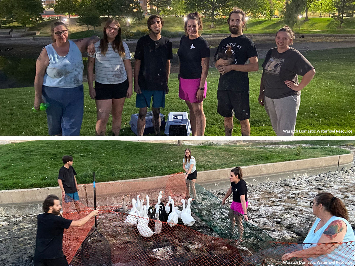 WSU joined forces with Wasatch Domestic Waterfowl Resource (WDWR) to safely gather 30 ducks and 34 geese while the campus’ Ada Lindquist Plaza pond was drained for maintenance. After 12 hours of combined effort, the ducks and geese were safely collected and all were adopted out to happy homes by WDWR.