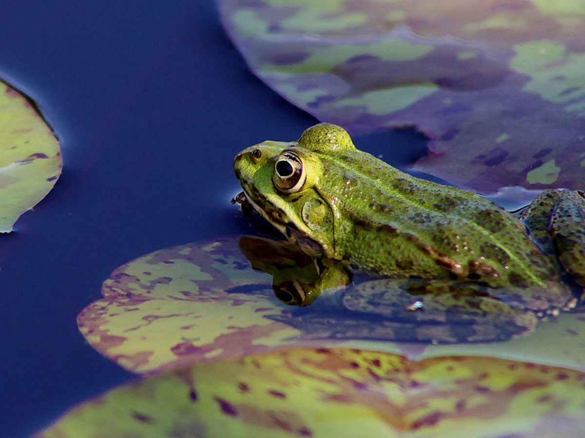 While they have lungs to breathe, frogs can also absorb oxygen through their slimy skin while underwater or on land. This adaptation allows some species to stay underwater for a few minutes and some can even hibernate in the mud at the bottom of a pond or lake for a few months!