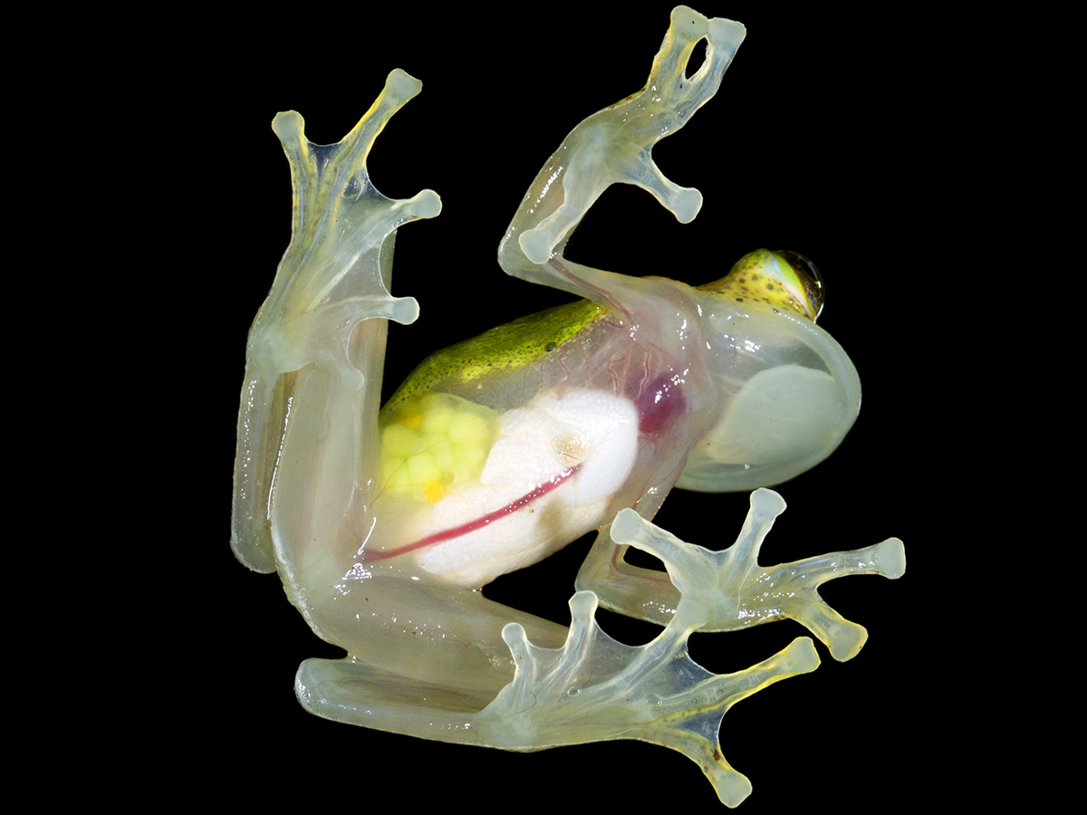 Some species of glass frogs have translucent skin on the underside of their bodies, which enables them to blend into their surroundings. Their beating hearts and internal organs can be seen, including their digestive system as it breaks down food.