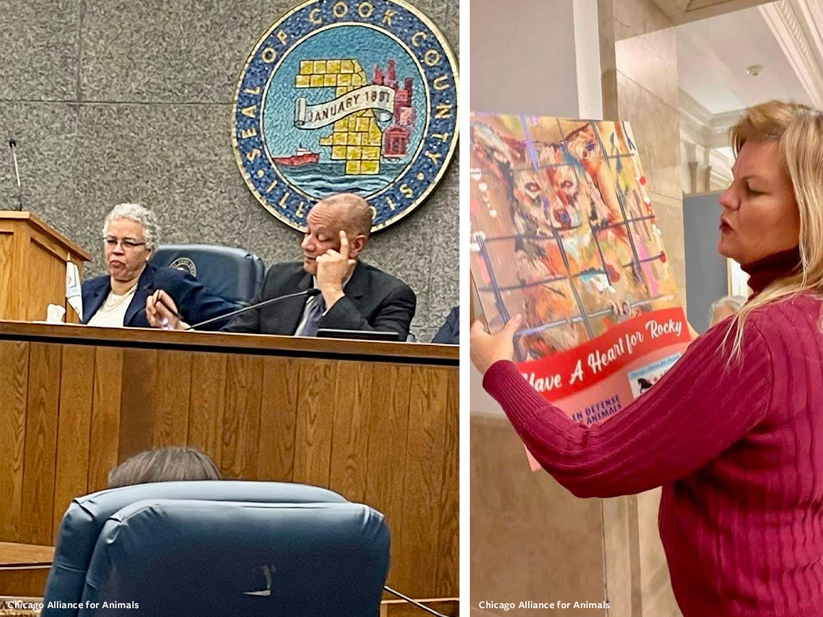 The Lincolnwood Trustees received a Valentine penned by Spur, an African sulcata tortoise in Lincolnwood. The president of the Cook County Board of Commissioners, Toni Preckwinkle, received a card from Rocky, a coyote in Northbrook. The giant cards were designed by artist Denise Katz Howick, who was inspired by the captive animals’ plight. Rocky and Spur’s cards contained compelling pleas for freedom to their captors and were co-signed by nearly 7,500 In Defense of Animals supporters. The message inside Rocky’s giant Valentine’s card was shared aloud by an advocate during the public comment period of the Cook County board meeting.