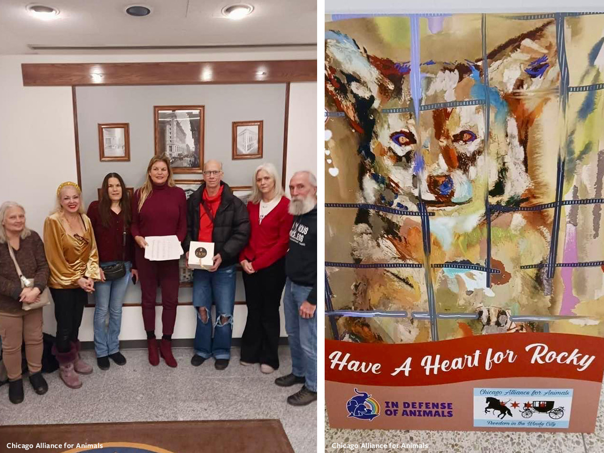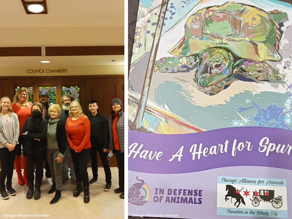 On February 7, 2023, In Defense of Animals and the Chicago Alliance for Animals delivered oversized Valentine’s Day cards from Rocky the coyote and Spur the tortoise who are suffering in extreme solitary confinement in the Chicago, Illinois area to advocate for their release to sanctuaries.