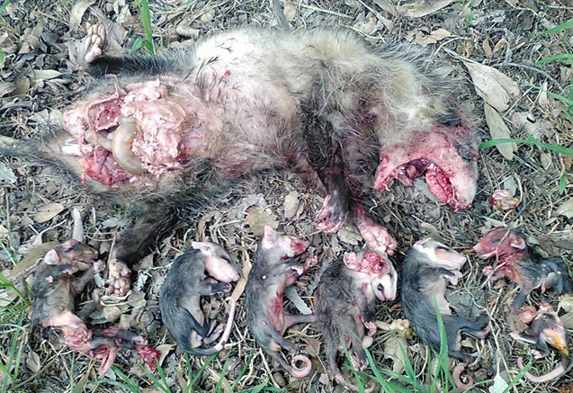 Finally, do what you'd want someone to do if you were laying in the road. Safely find a place to stop and check the victim. In the spring, female opossums are carrying their babies, and someone who hits and kills one is just as likely to have hit and killed a whole family. In a case we attended to this week, a mother and four of her dead babies were removed from the road, while two more dead babies were pulled from her torn-up body by one of our staff members. Tragically, all were dead, but this is not always the case. Check “road kill” and you could save lives.