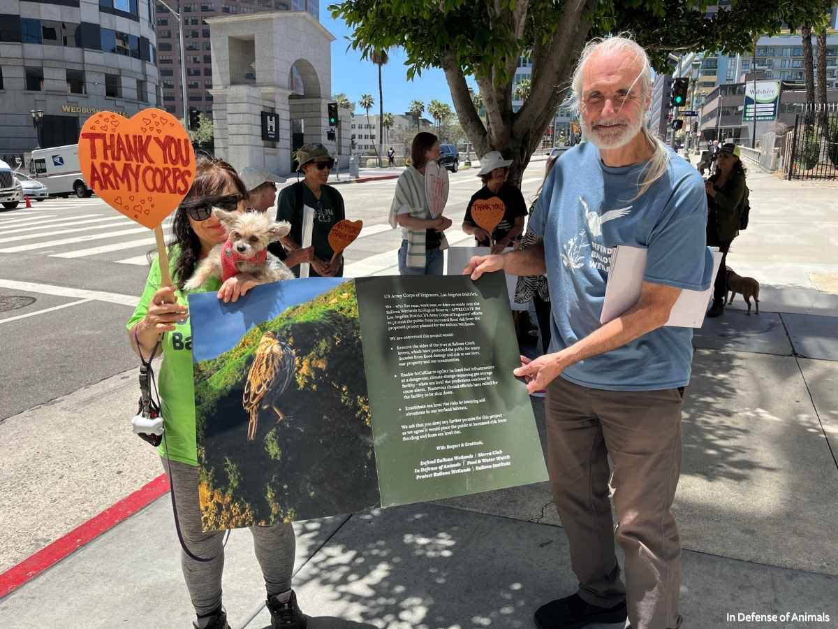 LOS ANGELES (June 13, 2025) — Ahead of the 250th birthday of the Army Corps of Engineers on June 16, advocates from Defend Ballona Wetlands and In Defense of Animals rallied at the U.S. Army Corps of Engineers in downtown Los Angeles to deliver a giant thank you card. On May 22, International Day for Biological Diversity and during American Wetlands Month, the event recognized the Corps for rejecting flawed flood data that was being used to justify a destructive plan to bulldoze Ballona Wetlands Ecological Reserve, and repair failing fossil fuel infrastructure within.