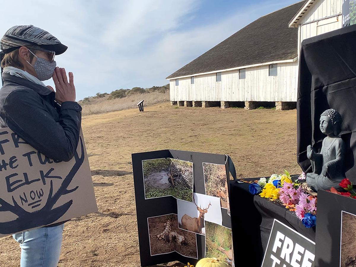 Point Reyes, Calif. (Nov 24, 2020) — Over 50 members of the public gathered with In Defense of Animals, ForELK, and TreeSpirit Project at a demonstration and memorial service on Saturday, November 21, to mourn the preventable deaths of over 15 Tule elk at Point Reyes National Seashore, as a result of ongoing mismanagement by the National Park Service (NPS).