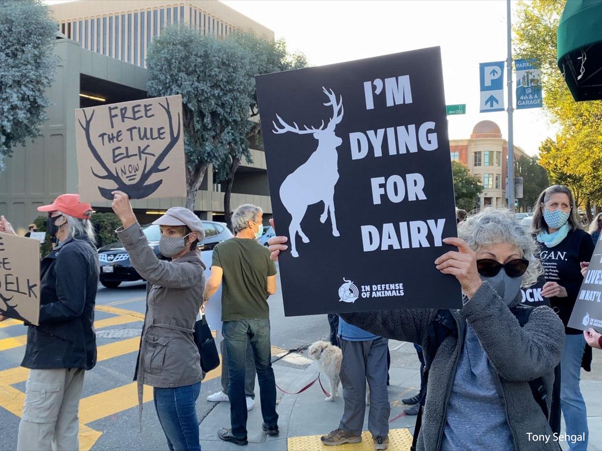 San Rafael, Calif. (Oct. 26, 2020) — In Defense of Animals, ForELK, The TreeSpirit Project, and Rancho Compasión rallied activists on Friday, October 23, below Congressman Jared Huffman’s Marin County office to denounce his support for the National Park Service’s (NPS) recently announced plan to kill rare Tule elk and expand public lands ranching and other for-profit businesses inside Point Reyes National Seashore.