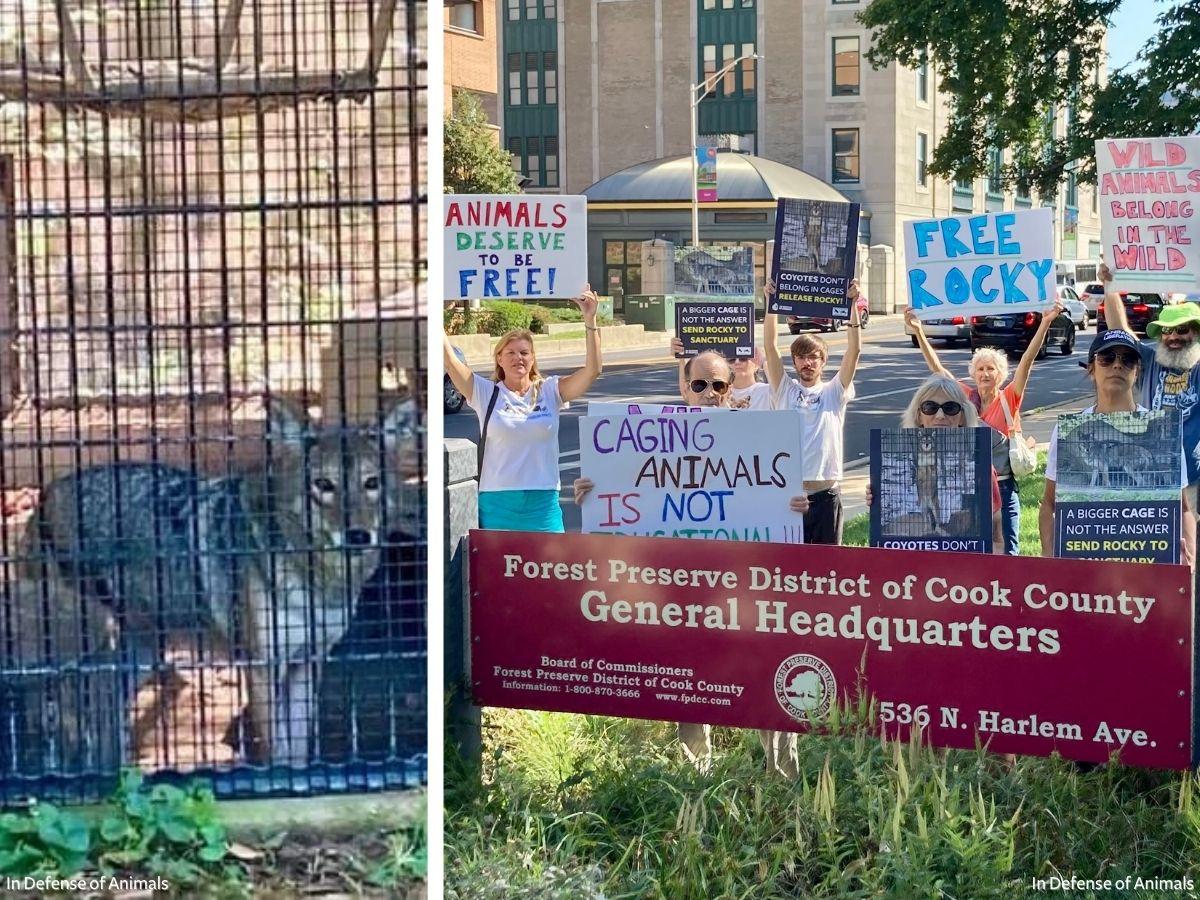 CHICAGO (Sept. 20, 2022) — On Monday, September 19, In Defense of Animals and Chicago Alliance for Animals held a day of action as pressure mounts on Cook County officials to release Rocky the suffering coyote from the River Trail Nature Center, after very alarming concerns were raised and documented by the public about his welfare.
