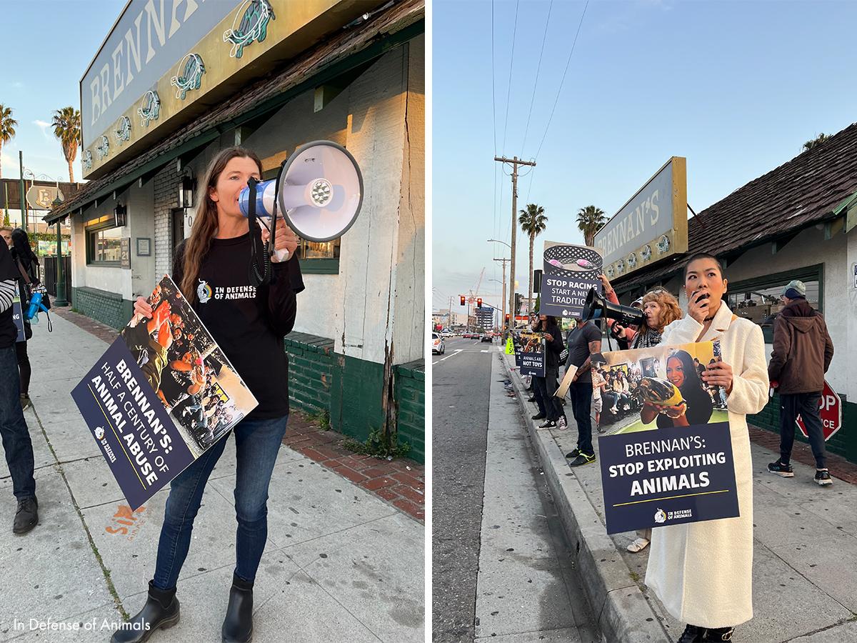 LOS ANGELES (March 22, 2024) — On Thursday, March 21, over 30 caring Los Angelenos joined In Defense of Animals, Los Angeles for Animals and Los Angeles Animal Defense League to protest animal cruelty at Brennan’s Irish pub in Marina del Rey. Since 1975, Brennan’s has been exploiting turtles for entertainment and profit by holding races, which it calls “the world’s stupidest sport”.