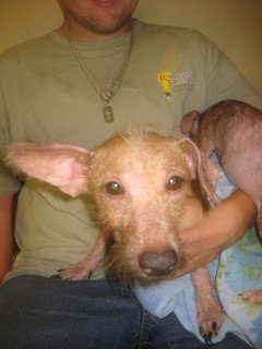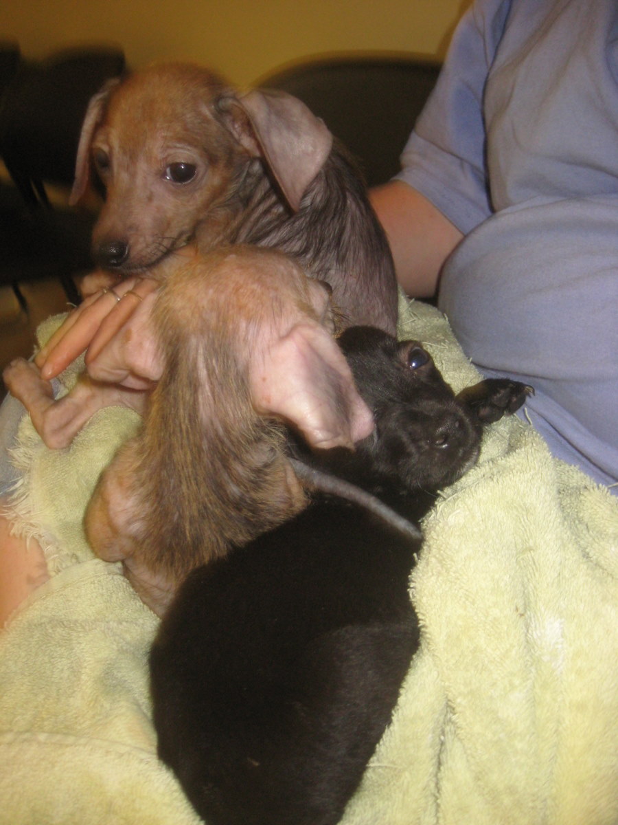 A smaller room in the back held crated dogs. Crate upon crate upon crate. In a bottom crate a totally naked dog managed to thump her tail while gunk oozed from her nearly closed eyes.