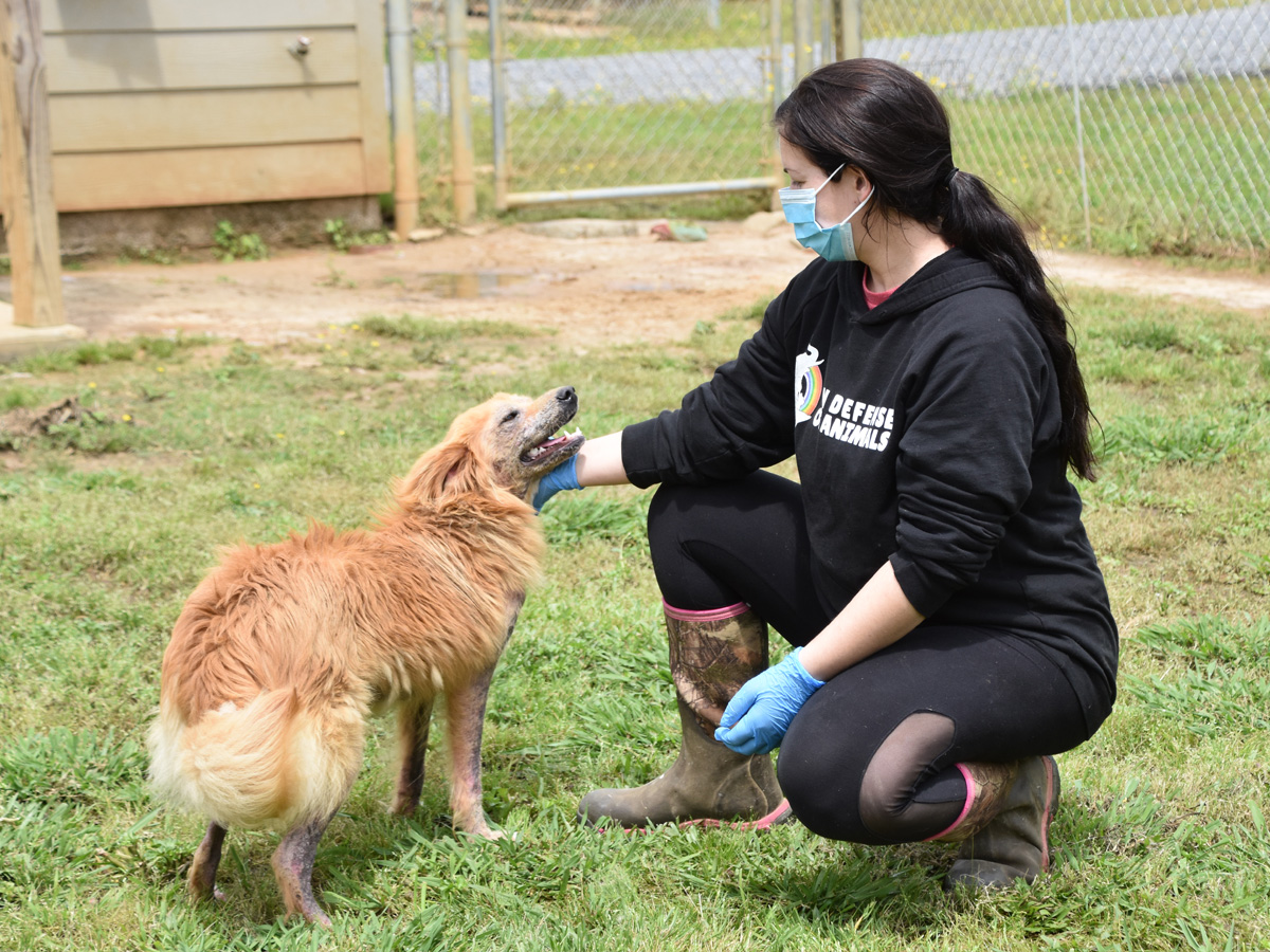 We rushed to the location and found a dog with severe skin issues trapped in a crate on a rural road. This road is already normally a low traffic road, but because of the COVID-19 shelter-in-place order, traffic hardly ever passes — leaving the dog little hope of being rescued and zero chance of surviving without help.