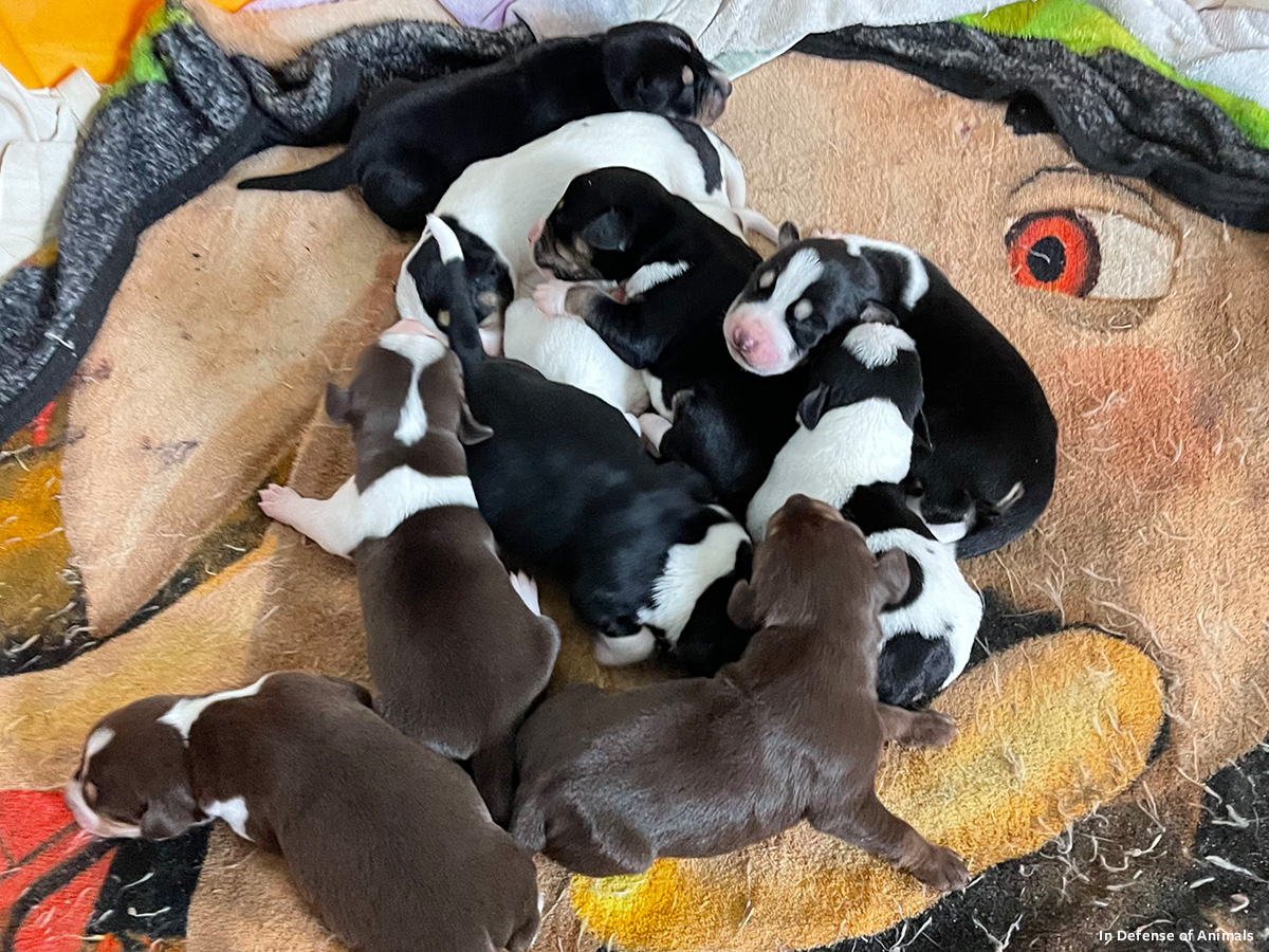 When they brought her back we named her Tally, and she was grateful to be given a soft, warm bed in her own warm house. A kiddie pool filled with blankets provided a safe and warm place for her to give birth. About a week later, she gave birth to 10 precious puppies!