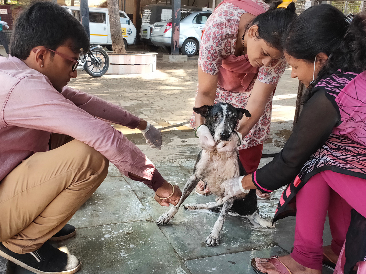 Vedant, one of our dedicated volunteers, helps our team give medicated baths to quite a few of our resident and blind dogs. These treatments help to address skin issues and eliminate fleas. The dogs greatly enjoy this special attention and pampering from the staff, which also offers relief from the heat!