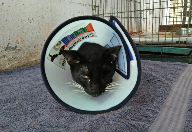 Finally, Roshni, a beautiful black cat with green eyes, benefitted from our first cataract surgery, with magnificent results! She had absolutely no vision left, with one eye infected badly, while the other eye was healthy otherwise, but had a cataract. The cataract was removed, and our chief surgeon decided to completely extract the badly infected eye.