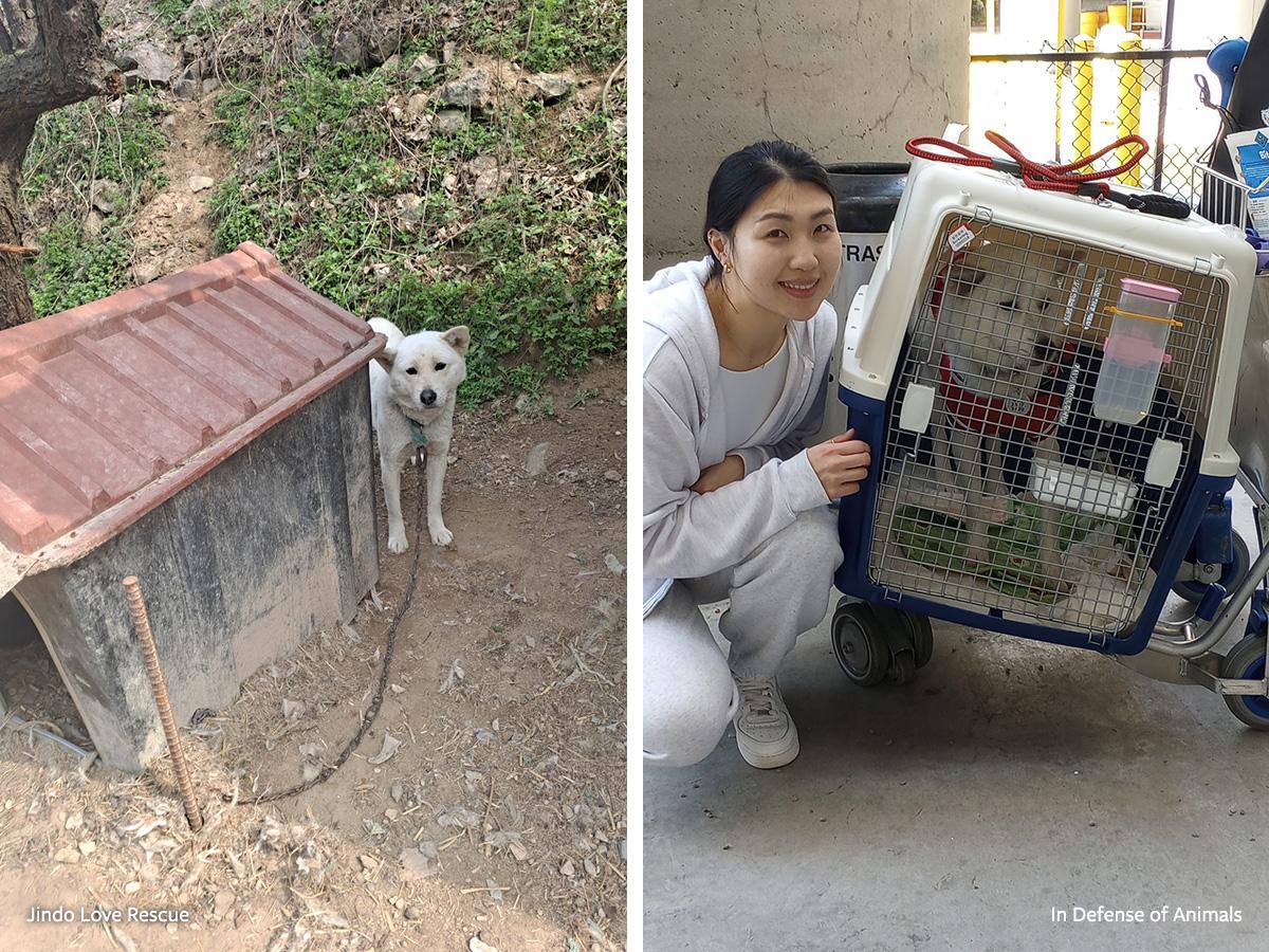 In 2023, we shut down the Miryang dog meat farm with our partner Jindo Love Rescue. Now we’re celebrating an incredible plot twist for Aurora, who was living on a chain in deplorable conditions there, but is now safely in her forever home in the U.S.