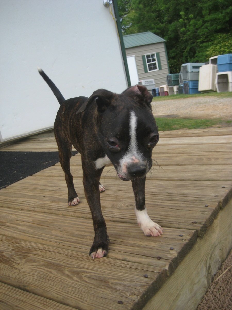A couple of days later I went back to the Pound to take some donated dog food to with Charlie. He told me there was a small dog with something wrong, but he wasn’t sure exactly what. I found a small, pitiful Boston Terrier-mix clearly in distress. She was cool to the touch, her breathing was shallow, and her lower eye-lids drooped. She was suffering from a double cherry-eye, but this was the least of her troubles. Acacia, as we know her now, was suffering from parvo. She was immediately put on drip. How she survived this long with no veterinary care is amazing. She was within hours of death and has taken several weeks to recover. The celebration of her recovery was joyous. She’s had surgery for her eyes and will be spayed this Wednesday. She is such a little darling. She curls up next to me each night and doesn’t move. Someone (in addition to me!) is going to fall absolutely in love with this sweetheart.